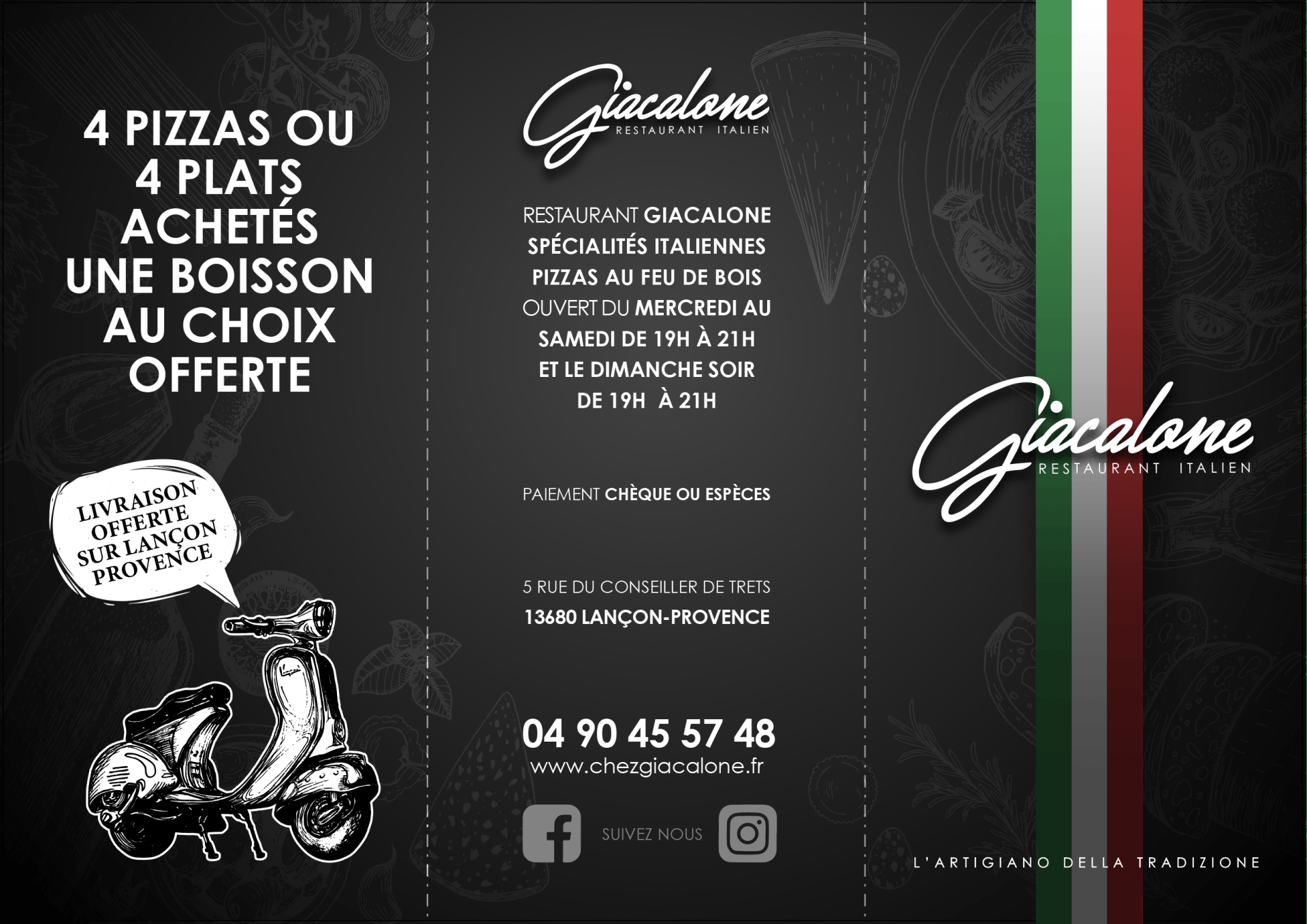 Venez déguster nos plats aux saveurs d’Italie : pizzas et calzones, pâtes, viandes et salades. Situés au 5 rue du conseiller de Trets à Lançon-Provence, nous bénéficions d’une facilité de stationnement grâce à un parking gratuit, place de la mairie à bientôt chez GIACALONE.